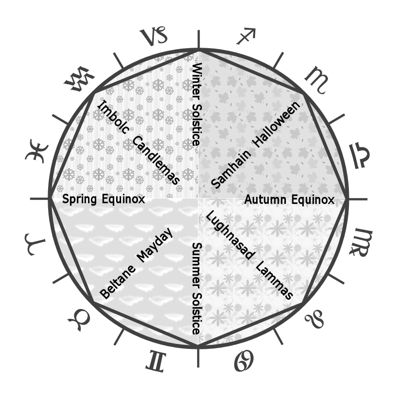 The zodiac is measured in terms of 360 degrees (°). The Sun moves more or less 1° per day. The quarter points are 90° from each other, and the cross-quarter points are 45° from the quarter-points (and also 90° from each other). The ancients, at least in Europe, where the seasonal changes of light and dark matter a lot, marked these cross-quarters as important festivals, celebrating and participating in the power of nature and her manifest expressions.