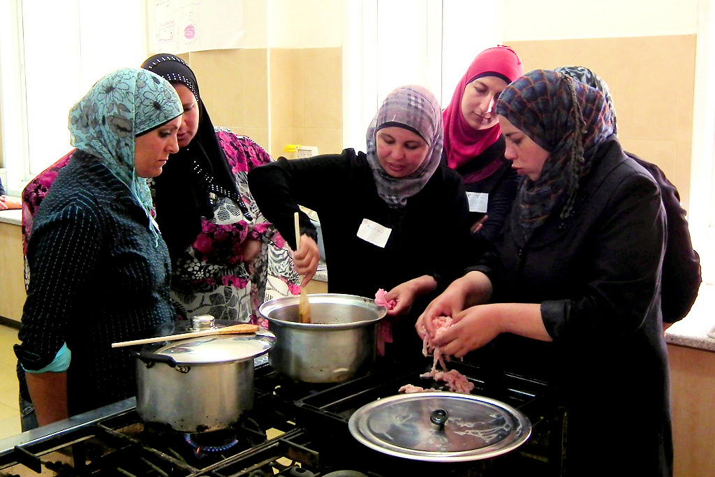 I shared some of my knowhow acquired from being a longstanding wholefood vegetarian. They didn’t know that the best source of protein is nuts (plenteous in Palestine), or that sesame seeds and tahini, a dietary standard here, provide the full range of amino acids which themselves facilitate the absorption of other proteins. At one point I asked them what the most important ingredient in cooking is. They suggested quality sources of foodstuffs, hygiene in kitchens, balanced diets… and then, after a pause, one of the illiterate women said, in Arabic, immediately translated, “The whole of your being”. Yes! She was closest to the point I was making: love. “If you cook with love, you bring Allah into the food, you heal people and it’s just like painting a picture or making music.” They all laughed, nodded and clapped.